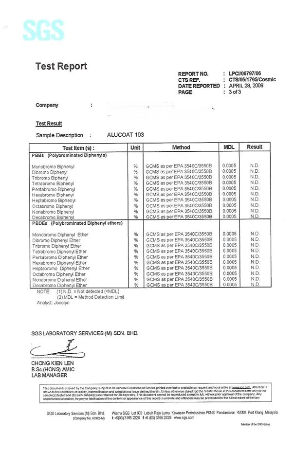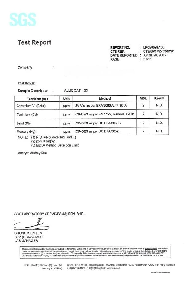 大約在十年前,歐美各國紛紛意識到六價鉻對人體和環境的危害,轉而致力於研究開發六價鉻處理液的替代品。出現了磷鉻化成膜工藝和鋯系無鉻鈍化工藝等新技術。目前應用較為廣泛的是以鉻酸和磷酸為主要成份的磷鉻化處理液。其在金屬表面所形成的磷鉻鹽氧化膜中雖然已經完全消除了六價鉻,鉻,但由於處理液中仍使用了部分的六價鉻鹽,對環境仍有一定的影響。以氟鋯酸鹽為主要成份的無鉻鈍化工藝雖然與磷鉻化成膜工藝同時出現,但由於技術仍不夠成熟,實際使用效果不理想和成本過高而沒有馬上被廣泛應用。直到2003年2月13日,歐盟的ROHS指令出臺以後,才被重新重視。泰暉企業有限公司代理銷售馬來西亞Discovery Sdn Bhd所生產的~新型鋯系無鉻處理劑-- ALCOAT 103,並且在新加坡和馬來西亞及中國大型鋁處理公司投入使用,完全符合現行標準規章試驗。